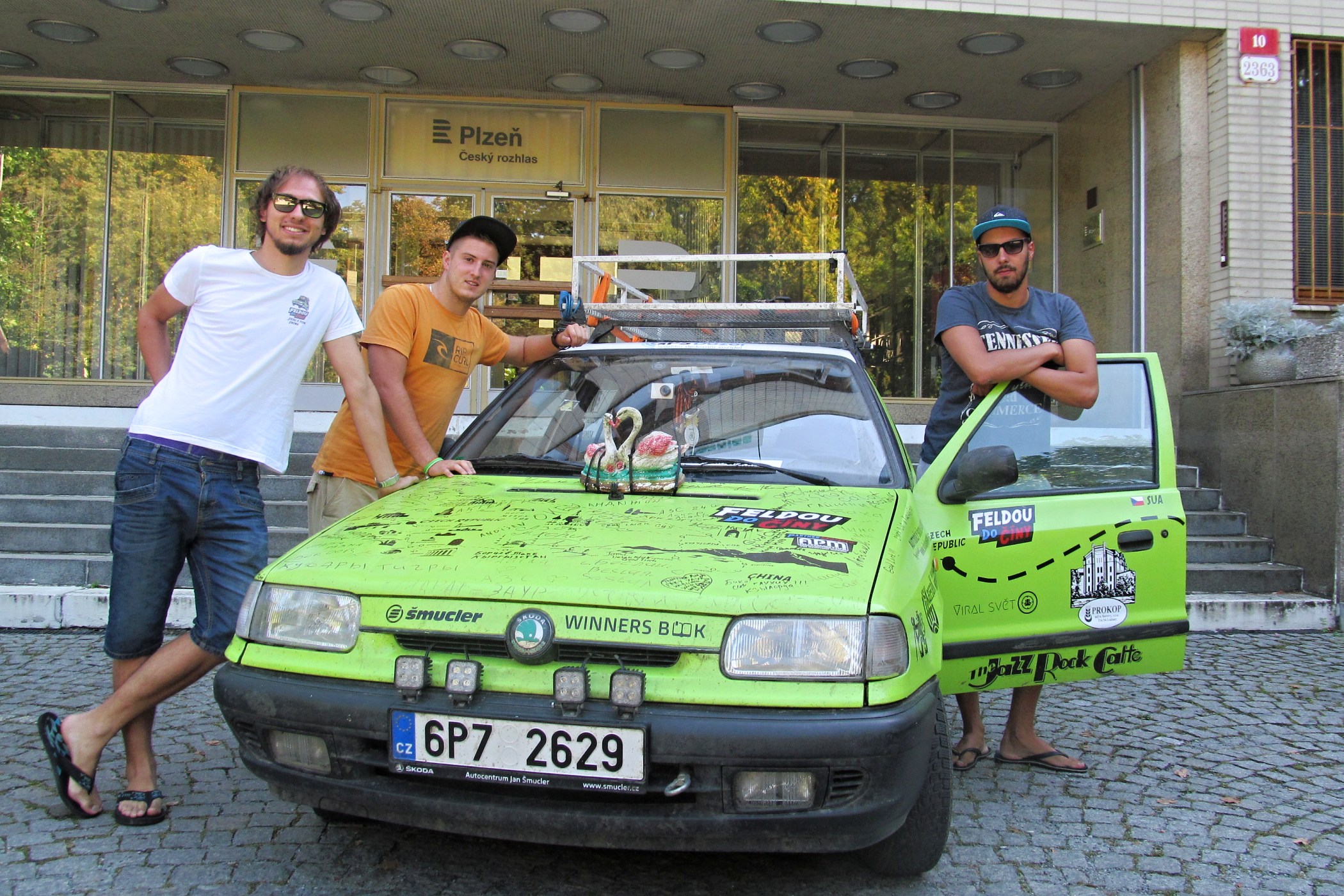 Na kapotě škodovky se jim za dobu cesty nashromáždila spousta vzkazů a podpisů v azbuce. Jelikož tohle písmo cestovatelé neovládali, ani netušili, že význam nápisu, který je v jedné zemi je neškodný, v sousední už může být vrcholně urážlivý, proto docházelo i na pečlivé mazání písmen za pomoci zubní pasty.