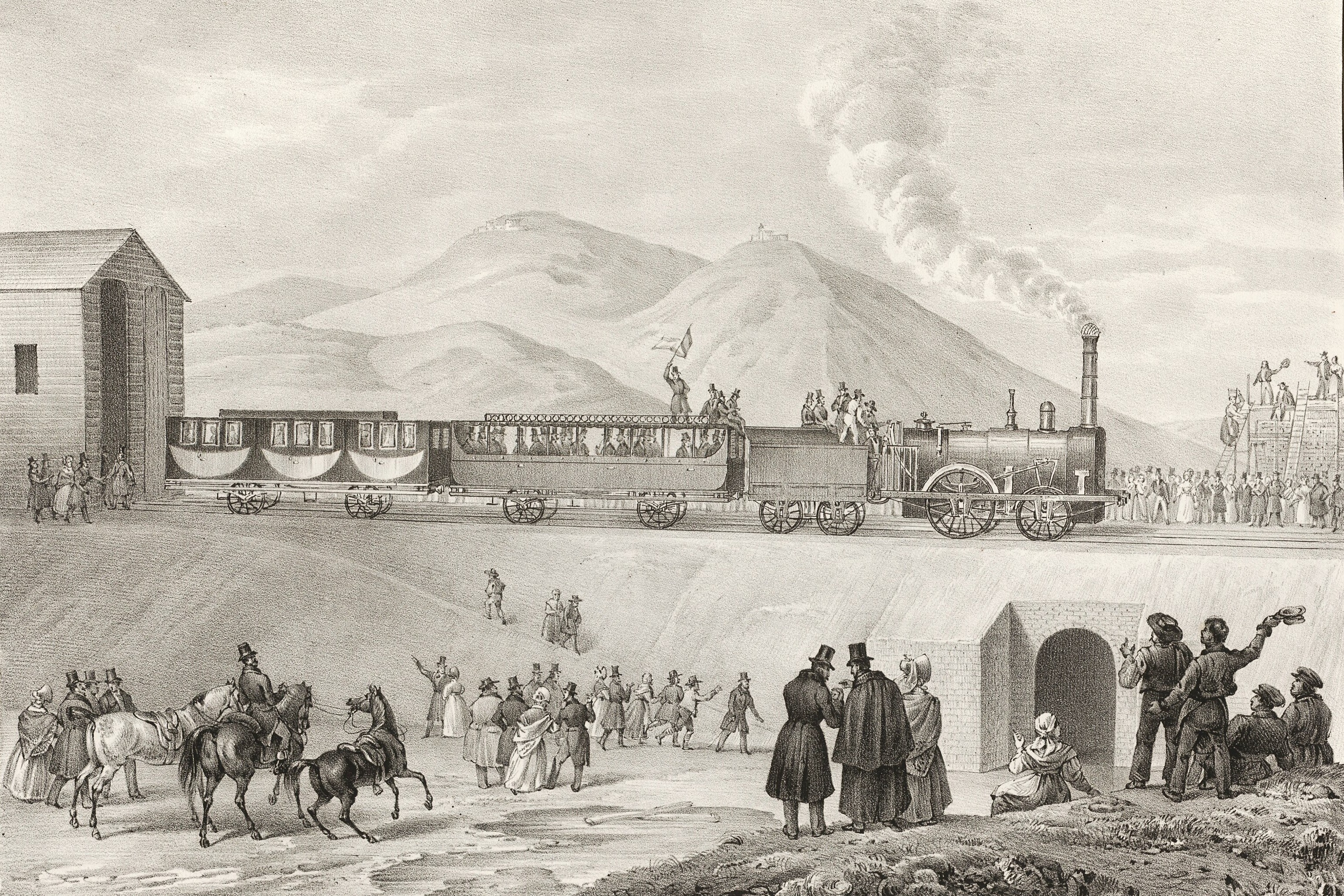 V polovině listopadu 1837 se na prvním úseku trati rozjel první vlak tažený parní lokomotivou s názvem Austria (jak jinak). Slavnostní jízdy se účastnil také arcivévoda Karl, jeho manželka Marie Karolína a jejich děti. Podle dobových zpráv byli nadšeni. První řádný osobní spoj vyjel o bezmála dva měsíce později v lednu 1838. Vlak tažený lokomotivou s názvem Moravia přepravil 218 cestujících.