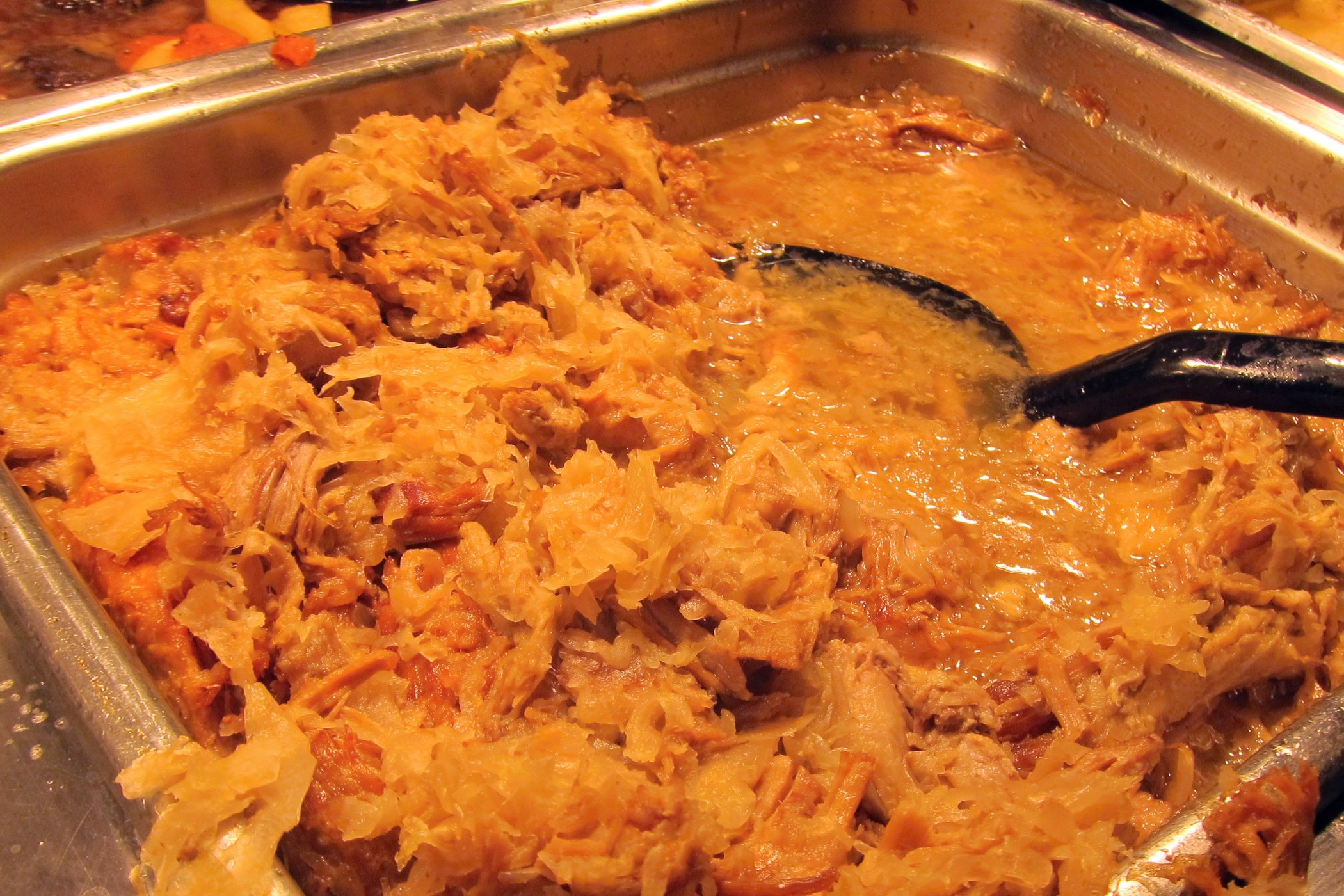 Když je maso na půl hotové, přidáme k němu kyselé zelí a dohromady dusíme, až je maso měkké. Nakonec ještě zaprášíme trochou mouky.