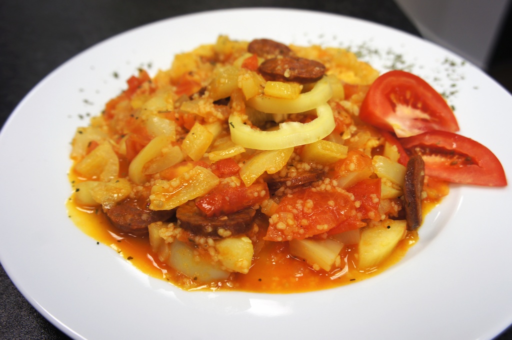 Houby a zeleninu očistíme, omyjeme a nakrájíme na menší kousky. V pánvi rozehřejeme tuk, na kterém osmažíme cibuli, k ní přidáme houby a papriky. Zamícháme, dochutíme solí a kořením. Přikryté dusíme za občasného míchání 20 minut. Přidáme rajčata a cuketu a dusíme ještě několik minut. Nakonec přidáme vejce a dokořeníme podle chuti. Prohříváme, dokud nejsou vejce hotová.