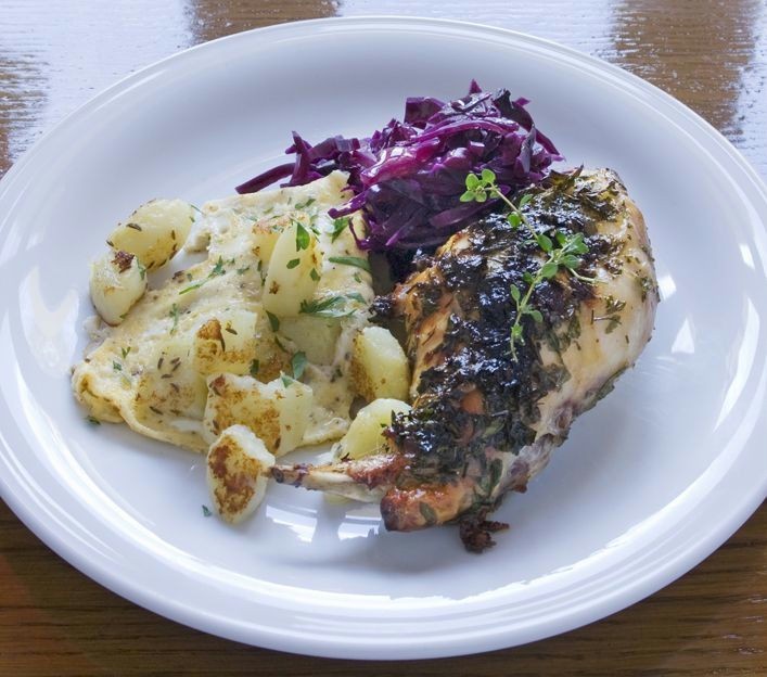 Králíka odblaníme, naporcujeme a protáhneme slaninou. Do pekáče dáme trochu oleje, na kterém orestujeme nadrobno nakrájenou cibuli. Přidáme osolené porce králíka a za občasného podlévání pečeme. Když je maso poloměkké, přidáme trochu jemně pokrájené petrželky, stroužek česneku, na plátky pokrájené hříbky, bílé víno, oloupaná rajčata a trochu kečupu. Dusíme doměkka.