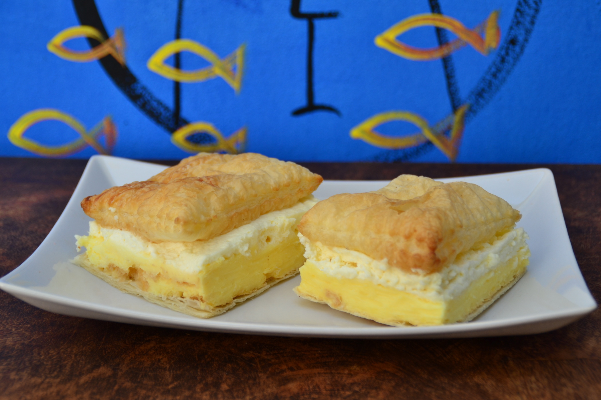 - Vychladlý pudink rovnoměrně potřeme šlehačkou, zaklopíme druhým plátem pečeného listového těsta a dáme do chladna na den proležet.