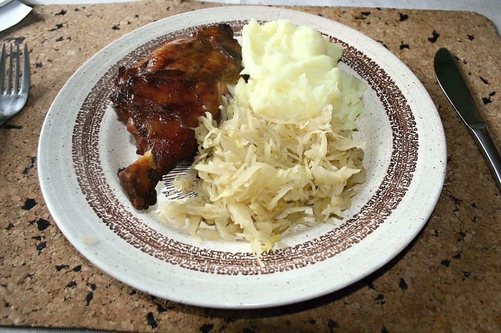Slaninu nakrájíme na kostičky a osmahneme. V trošce vody rozvaříme masox. Do malého pekáče vložíme zelí, které zasypeme slaninou a zalijeme masoxovým vývarem. Vše dobře promícháme. Na takto připravenou spodní vrstvu položíme osolené a okořeněné čtvrtky kuřete. Pekáč vložíme do trouby a pečeme necelou hodinu při teplotě 200° C. Při pečení občas kuře potřeme olejem.