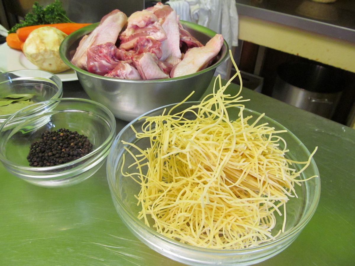 Z kuřete připravíme vývar – kuře stáhneme z kůže, přidáme pepř, nové koření bobkový list a osolíme. Vaříme asi 1 a půl hodiny. Vývar přecedíme (použijeme asi 1 litr) , kuře obereme a nasekáme na malé kousky. Do hrnce dáme lžíci másla, na kostičky nakrájenou cibuli a kořenovou zeleninu, osmahneme na másle. Přidáme maso zalijeme vývarem a necháme 10 minut vařit.