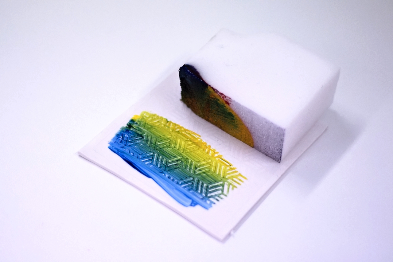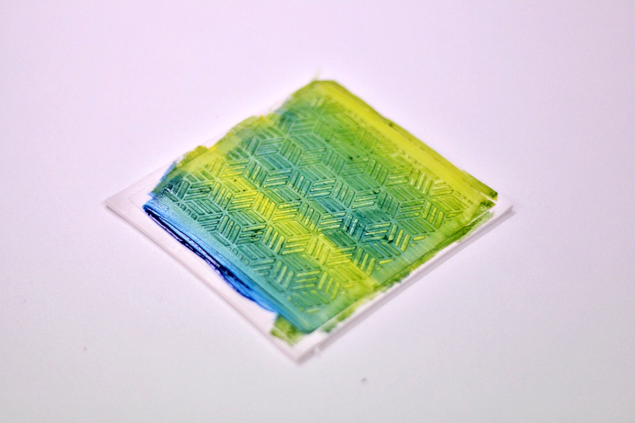 4. Barvy mezi sebou můžeme libovolně míchat a nanášet je přes šablonu na plát v různém pořadí i několikrát za sebou. Všechny mezery v šabloně by měly být zakryté barvou, aby vzor hezky vynikl (foto).