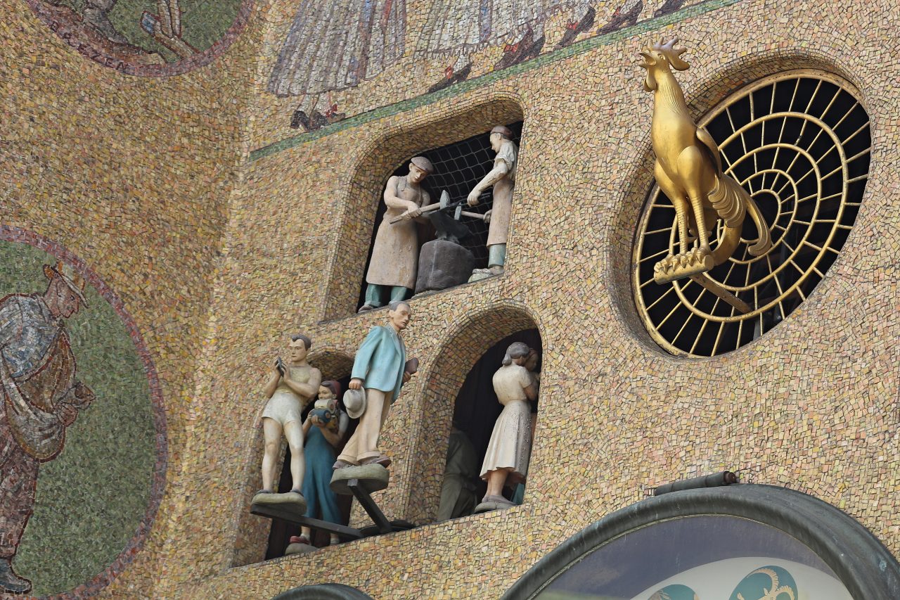Mezi pohyblivými figurami vidíme kováře, spolu s pištci jsou propojeni s hodinovými cimbály a flétnami. V poledne vystupují z okének třeba matka s dítětem, žena s taškou a konví na mléko, muž v obleku s úřednickou aktovkou, švadlena, řemeslník, kopáč, kuchař či sportovkyně s míčem a další lidé 20. století.
