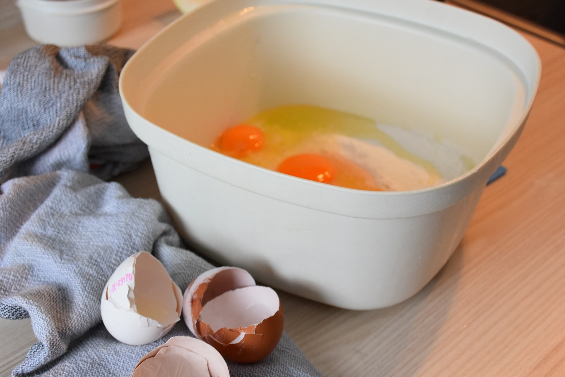 1. Všechny suroviny na těsto ušlehejte a těsto vlijte na hlubší plech vyložený pečícím papírem.