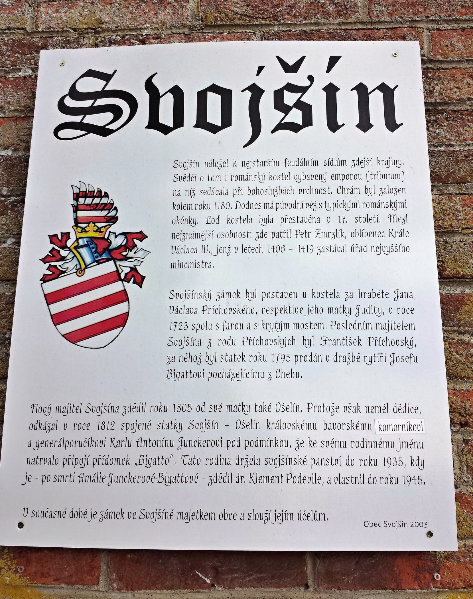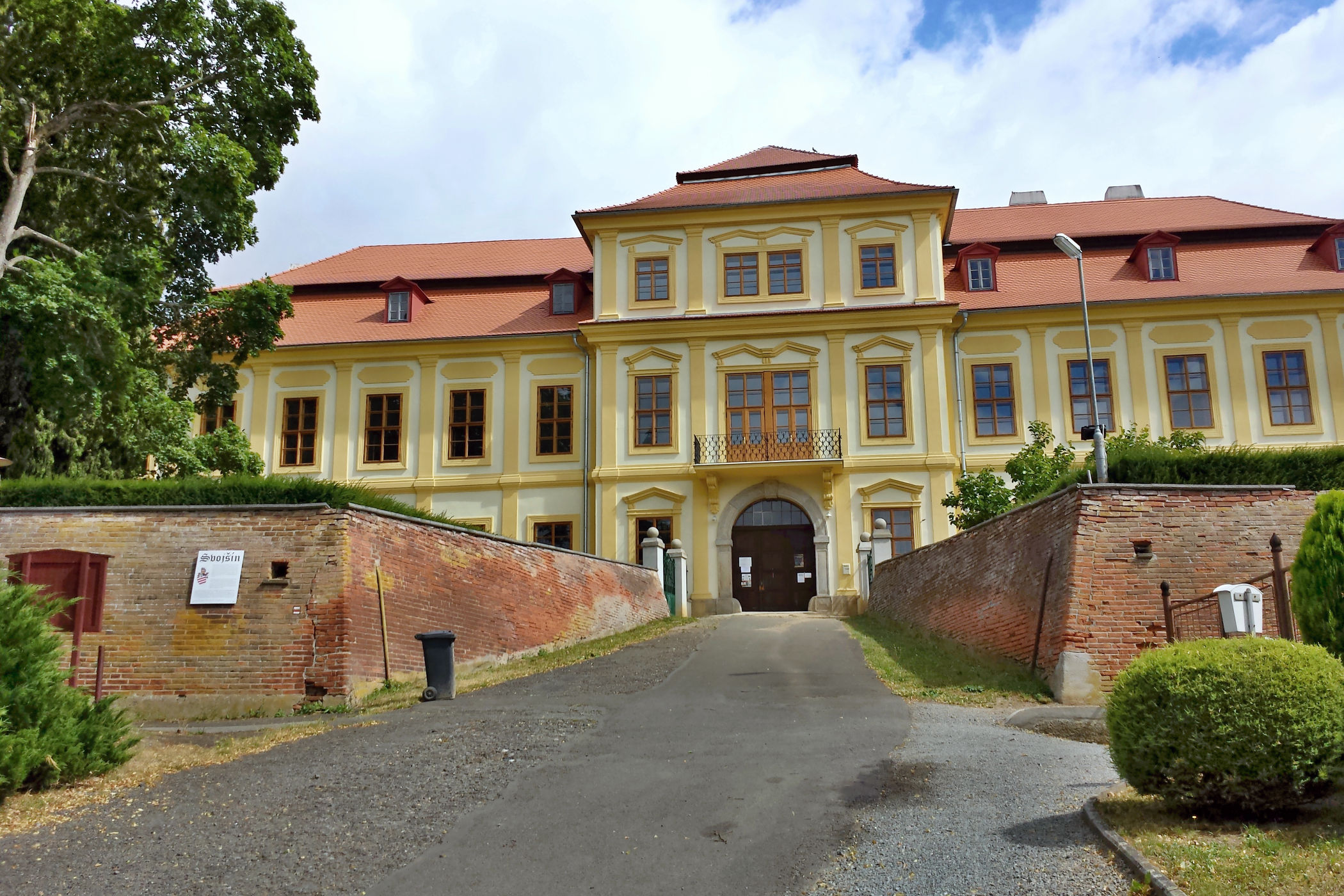 Svojšínský zámek nelze přehlédnout. Majestátně se rozkládá na horním konci návsi, v sousedství kostela sv. Petra a Pavla.