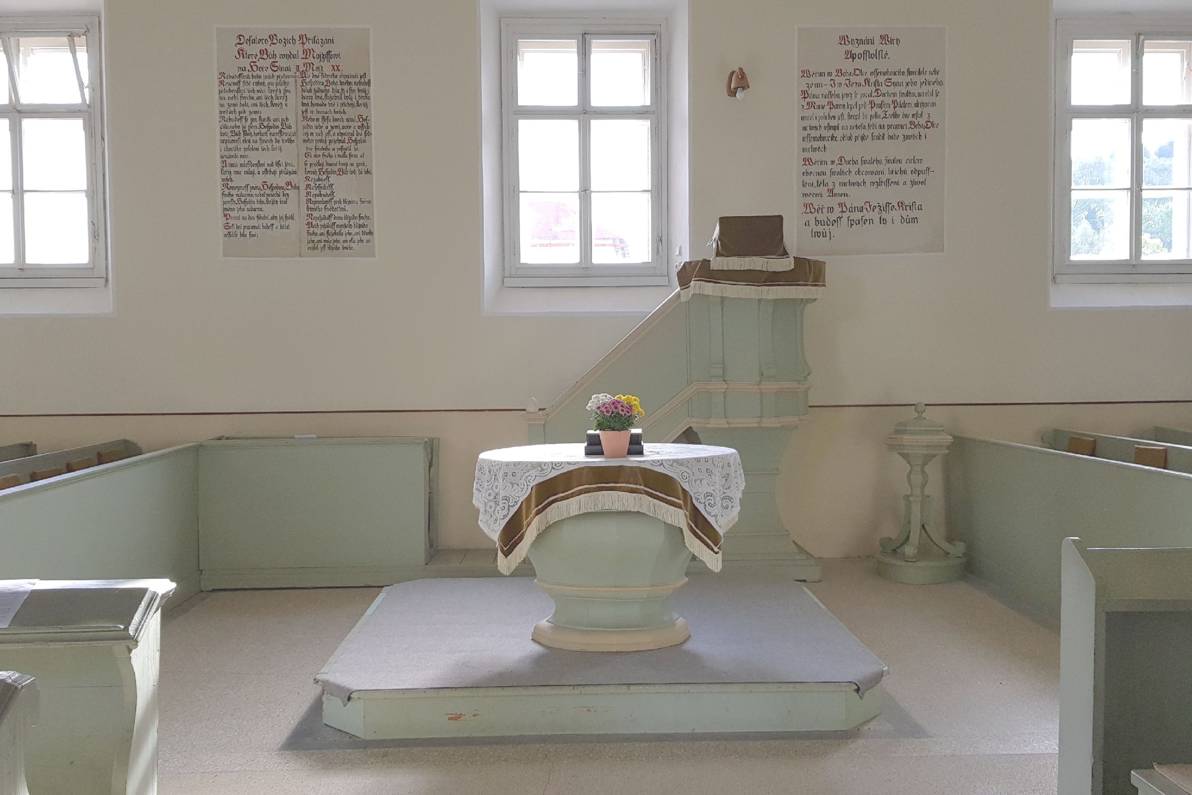 Lavice jsou kolem stolu Páně rozestavěné ze tří stran. Dnes si rodiny sedají pěkně pospolu, vždy tomu ale tak nebývalo. Byl daný zasedací pořádek. „Na jedné straně sedali muži, na druhé ženy a děti sedaly nahoře na kruchtách,“ ukazuje Miroslav Zelený. Příchozí se také často diví, proč nemají lavice jednotnou podobu. „Každá rodina si vyrobila svou lavici. Někdo měl rád zdobnější, někomu stačila jednodušší, anebo zdobnější neuměl vyrobit,“ vysvětluje kurátor.
