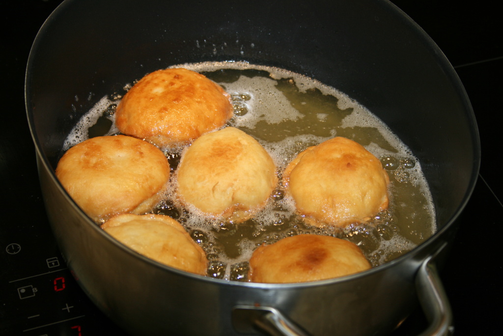 Na pánvi rozpálíme sádlo a smažíme vykynuté tvary.